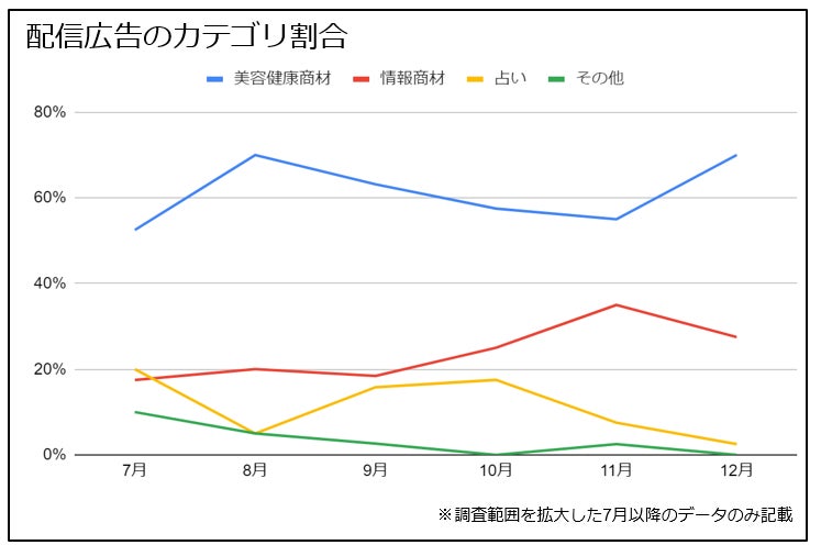 調査にて一定量以上の配信が確認された広告においてその割合の変化をみると、多数を占めていた美容健康商材が徐々に減少し、代わりに情報商材の比率が増えております。但し、年末にかけては男性機能向上を謳う健康食品が多く配信され、美容健康商材の割合が再度高まるなど、時期的要因もみられます。