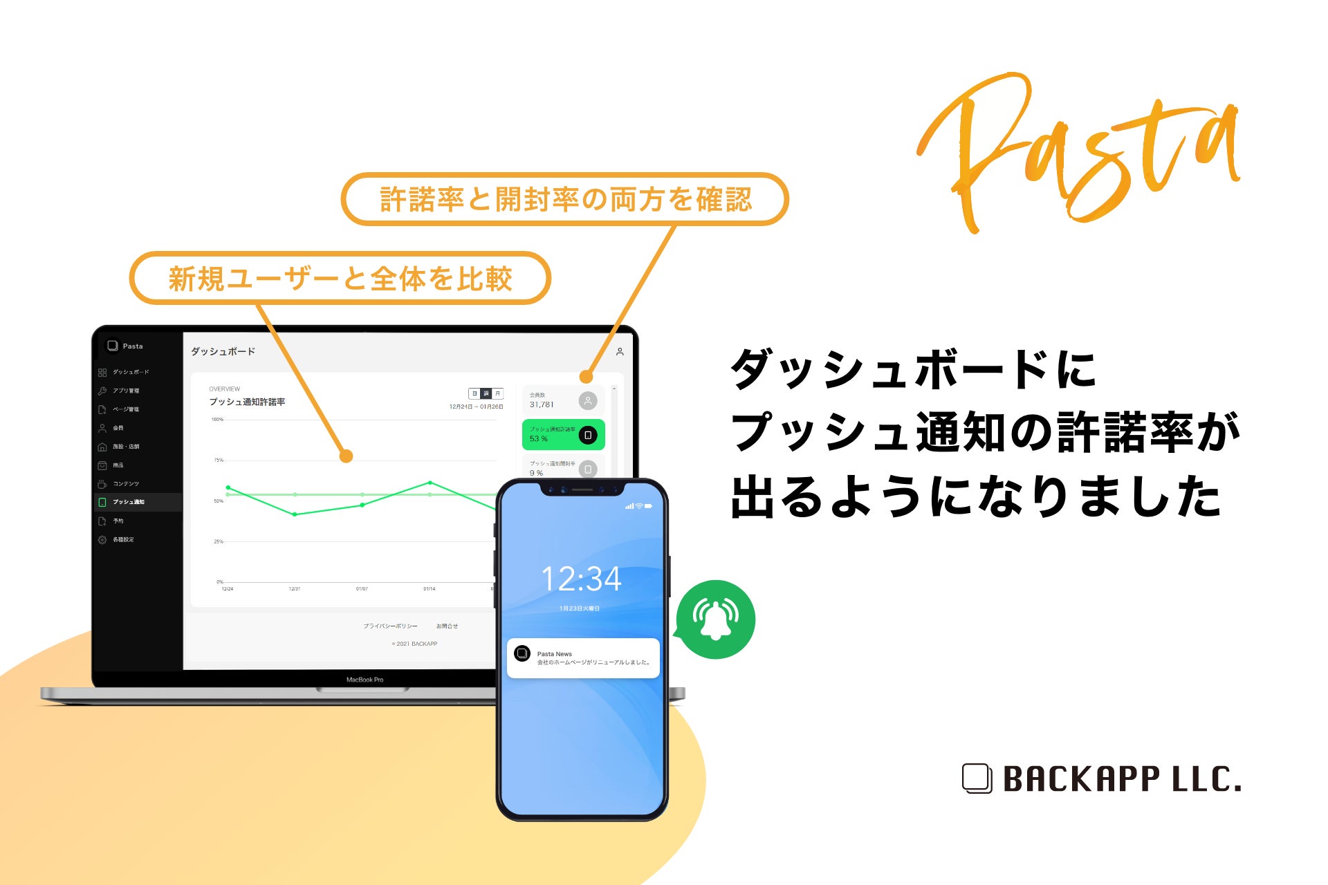 モバイルアプリ開発の合同会社バックアップ(所在地:千葉県習志野市奏の杜2-2-2-1315、代表社員:岡田耕治)は、アプリプラットホーム「Pasta」のアップデートを実施し、ダッシュボードにプッシュ通知の許諾率を表示できるようになりました。