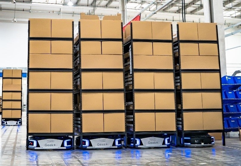 当社では、2018年より1つ目のEC倉庫である東日本FCに株式会社ギークプラス社製の自動搬送ロボット「EVEシリーズ/P800R」を導入しており、現在は216台のロボットが稼働しております。ロボットの導入により、2023年時点(2018年対比)で生産性を4倍向上させ、出荷リードタイムを1/2に短縮することに成功しています。
