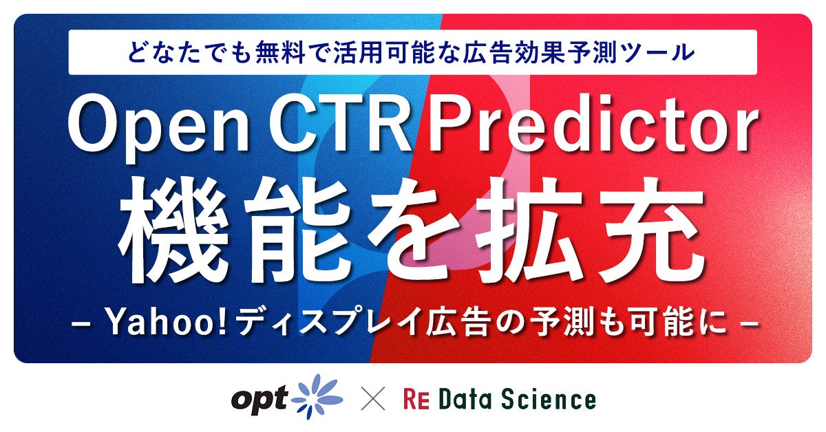 「デジタルで、この国の新しい基本をつくる。」をミッションに掲げ、顧客の事業成長に伴走する株式会社オプト(本社:東京都千代田区、代表取締役社長 CEO:栗本 聖也、以下、オプト)は、データ解析・機械学習技術を用いたサービス企画・開発を手がける、Re Data Science株式会社(本社:千葉県柏市、代表取締役社長:高田 悠矢、以下、Re Data Science)(※1)と共同で企画・開発を行っている広告効果予測ツール「Open CTR Predictor」において、Yahoo!ディスプレイ広告(※2)に対応した機能の拡充をしたことをお知らせいたします。