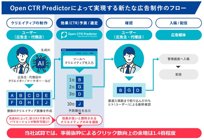 「Open CTR Predictor」は、広告クリエイティブの制作時に、広告代理店や広告主自身が無料でCTR(※4)を事前に予測することができるツールです。選抜されたクリエイティブのみを入稿・配信することにより、広告効果の安定的な向上が期待されます。当社の試算(※5)では、事前選抜によるクリック数向上の余地は1.4倍程度と見なすことができます。