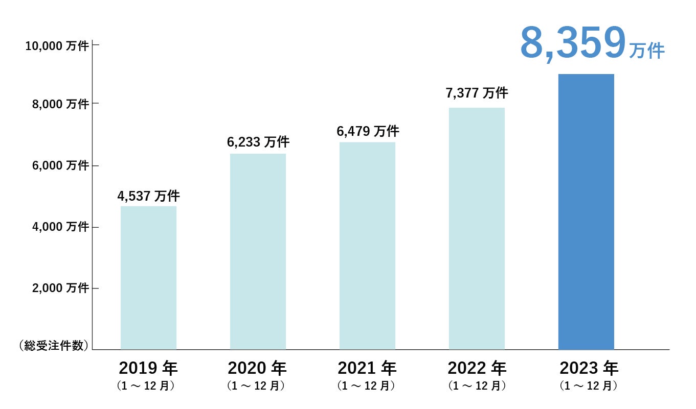 年間の「ecbeing」全ユーザーの総受注件数は2019年が約4,537万件、2020年は約6,233万件、2021年は約6,479万件、2022年は約7,377万件、2023年は約8,359万件と5年連続で年間流通総額に比例して増加しています。