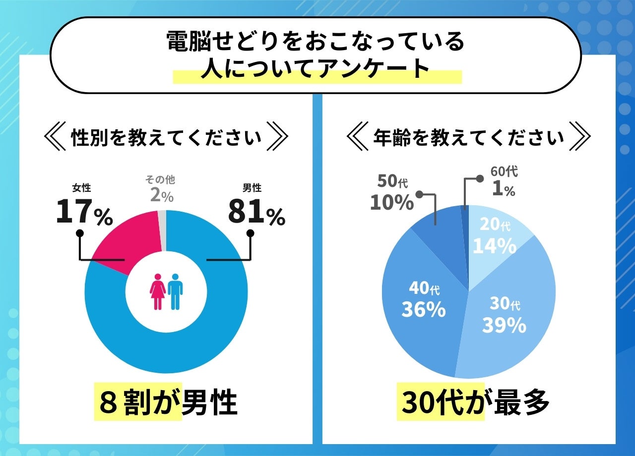 ・回答者の年齢層は30代が最も多く39.0%、次に40代が多く36.0%、回答者の男女比はおおよそ8:2となりました。