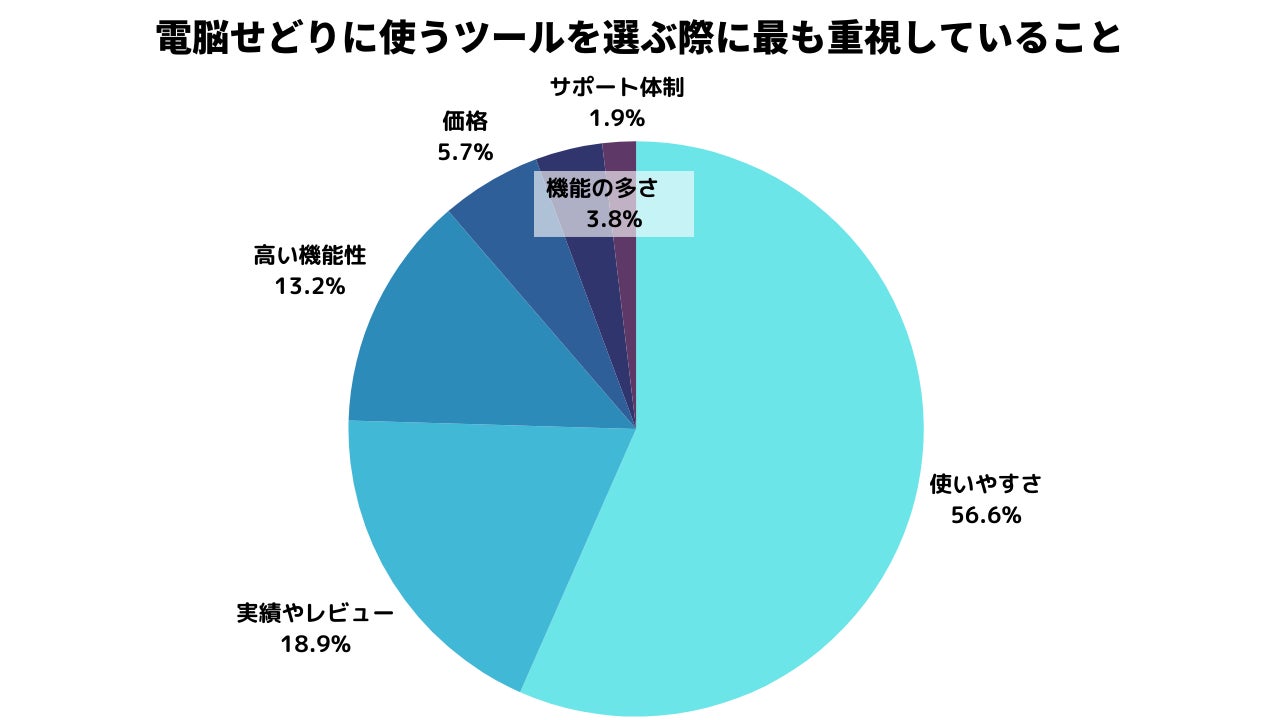 「使いやすさ」と回答した人が一番多く56.6%、次に「実績やレビュー」が多く18.9%という結果になりました。