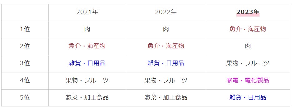 2023年はこれまでの肉に代わり、魚介・海産物が1位になりました。