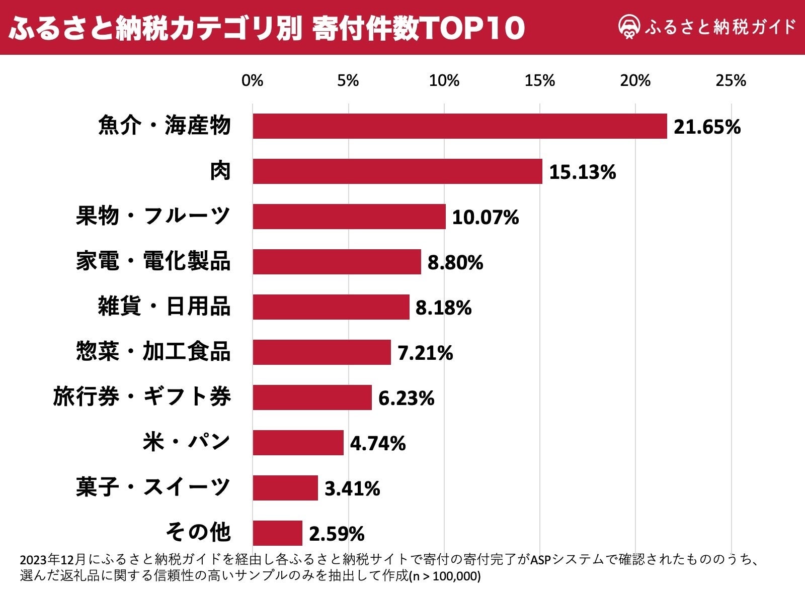 - 対象:2023年12月に「ふるさと納税ガイド」を経由し各ふるさと納税サイトで寄付の寄付完了が外部システムで確認されたもののうち、選んだ返礼品に関する信頼性の高いサンプルのみを抽出して作成(調査サンプル:10万件以上)