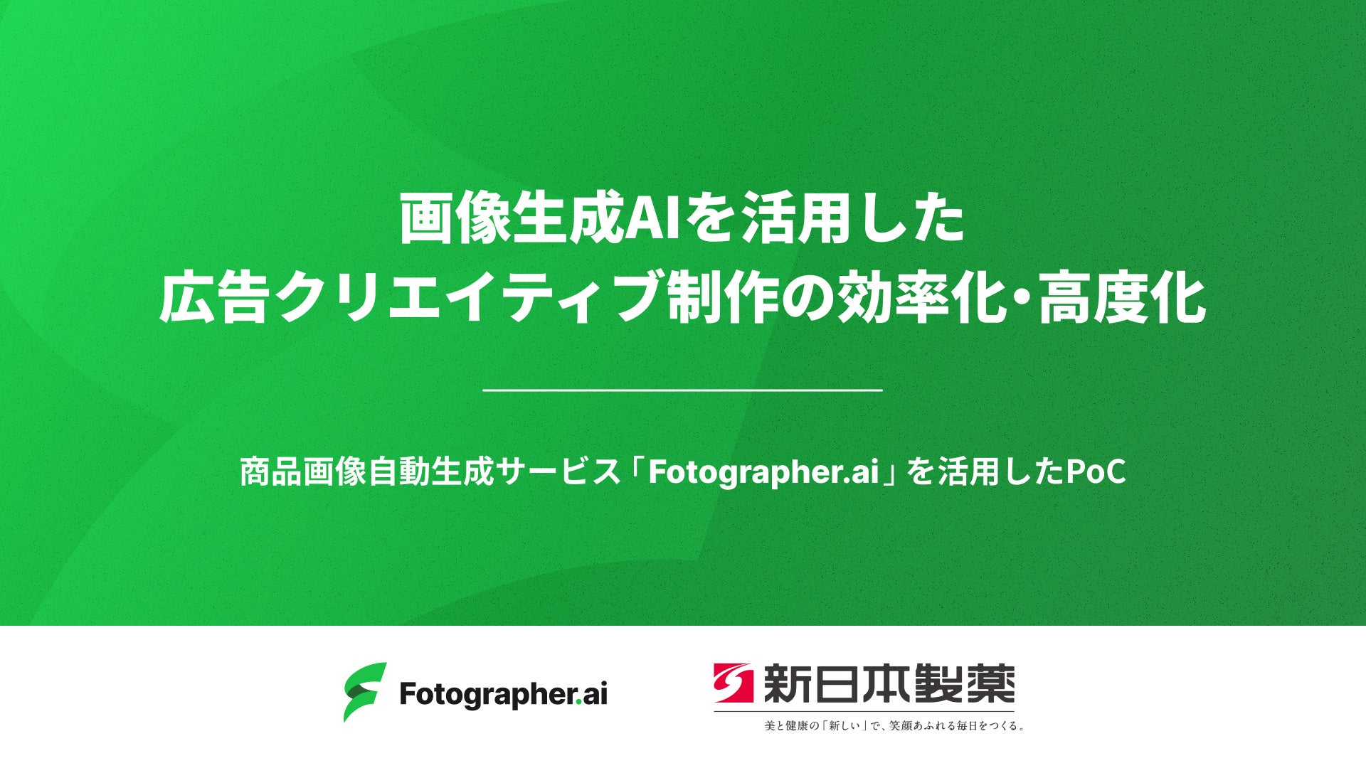 生成AIによる商品画像自動生成サービス「Fotographer.ai」を提供するFotographer AI株式会社(所在地:東京都渋谷区、代表取締役 : 鈴木 麟太郎、以下:Fotographer AI)は、通信販売を主軸に化粧品などを扱うスキンケア事業と健康食品・医薬品などを扱うヘルスケア事業を展開する新日本製薬株式会社(本社:福岡市、代表取締役社長CEO:後藤 孝洋)と画像生成AIを活用した広告クリエイティブ制作の効率化・高度化のPoCを開始しました。これにより、通販、マーケティングや、デザインの担当者が、自社の広告クリエイティブ制作の手間とコストを削減しながら、マーケティング施策のPDCAを高速化することを目指します。その一環として、まずは、PoCで化粧品広告のラインバナー用の商品画像生成から生成AIで取り組みを開始します。