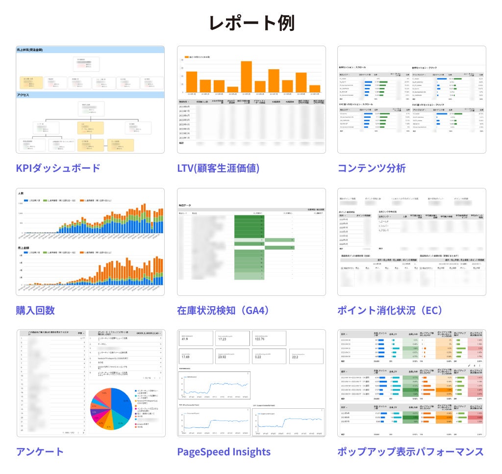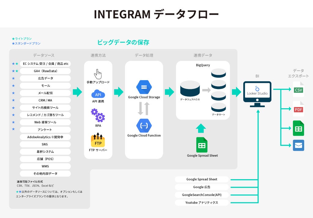 INTEGRAMは、ECシステム内の受注や会員を始め、アクセス解析ツールや広告、モールなど様々なデータをBigQuery(データウェアハウス)へ集約し、Looker Studio(BI)にてレポートを表示するサービスです。数値の解釈も分析コメント※ にて提供するため、数値を眺めるだけにならない、仮説や改善案を定期的にご提案します。