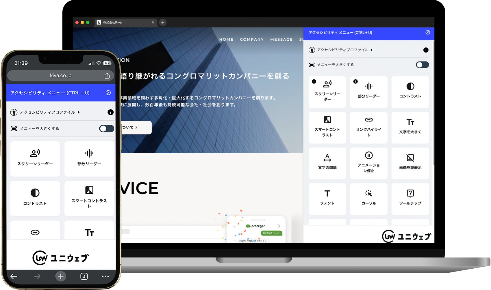 ウェブアクセシビリティサービス「ユニウェブ」は、高齢者や障害のある方々がウェブサイト上の情報を正しく理解できるよう、音声読み上げやコントラスト変更、文字サイズ変更などを簡単に選択・変更することが可能です。