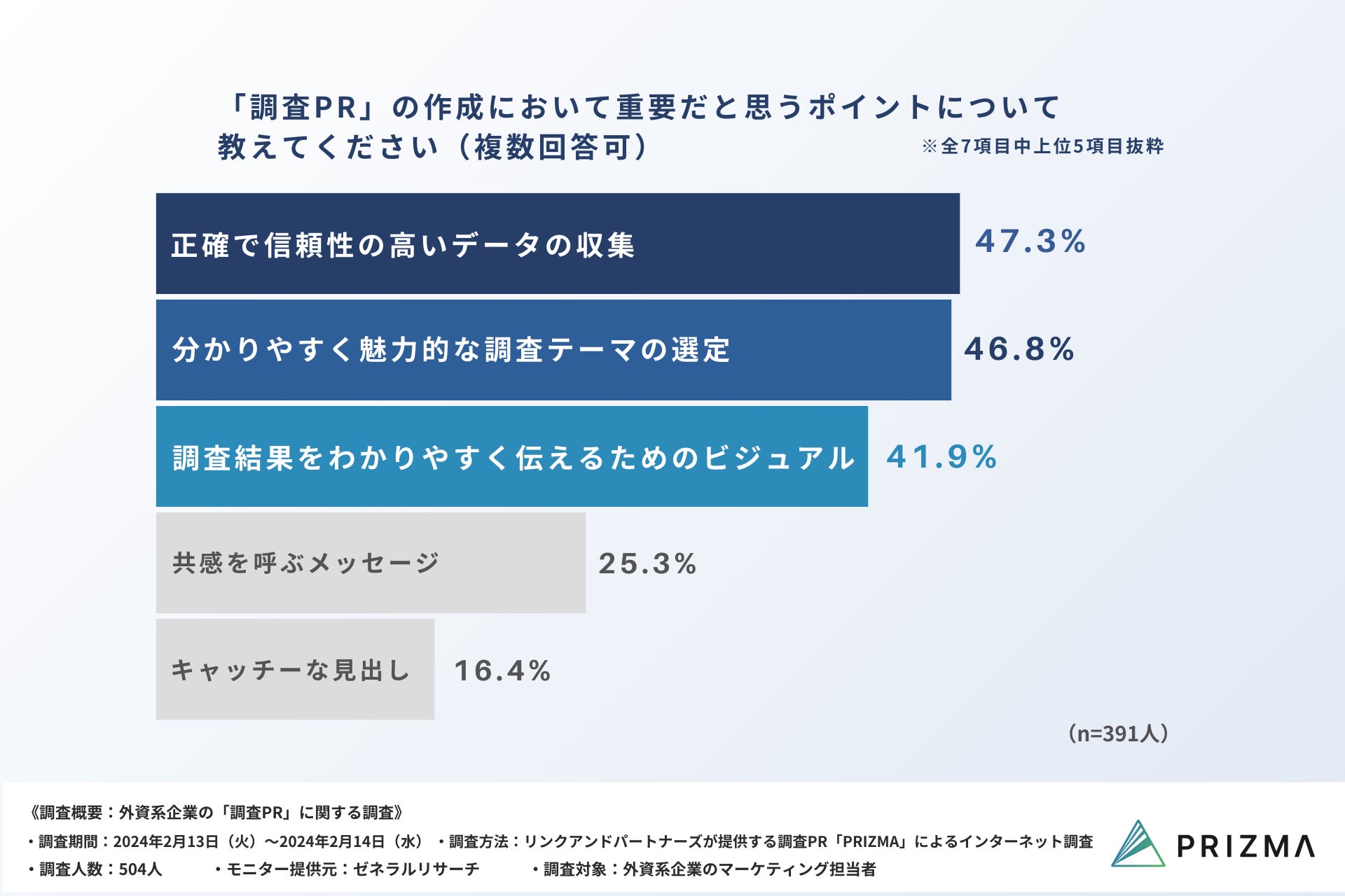 ・「調査PR」の作成において「正確で信頼性の高いデータの収集」を最も重要視する結果に