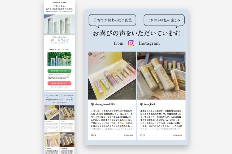 新規獲得用LPでは、Instagramに投稿されたUGCを掲載。お客様からの喜びの声として、「ドモホルンリンクルをはじめたきっかけ」や「使用した際の感動体験」が表現されたInstagram投稿を掲載し、CTRやCVRをはじめとする定量データや、UGCから見えてくる顧客インサイトをもとに、UGCの掲載位置や表示するUGC、UGC上部のバナーの運用を行うことでCVR1.51倍を実現することができました。