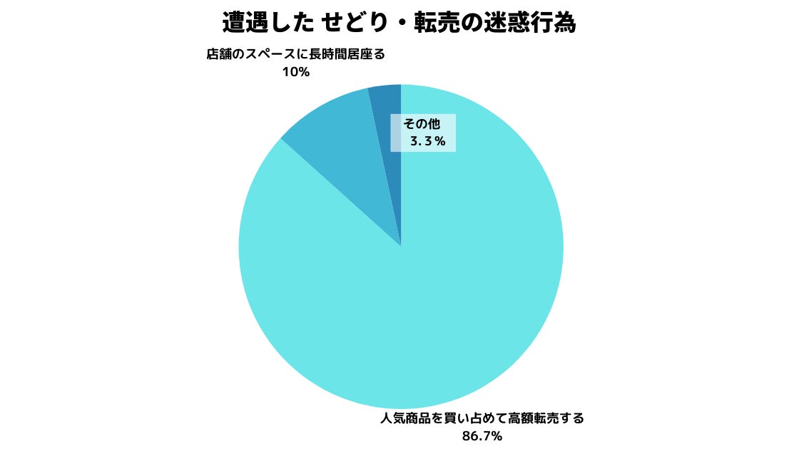 「人気商品を買い占めて高額転売する」と回答した人が一番多く86.7%、次に「店舗のスペースに長時間居座る」と回答した人が多く10.0%という結果になりました。