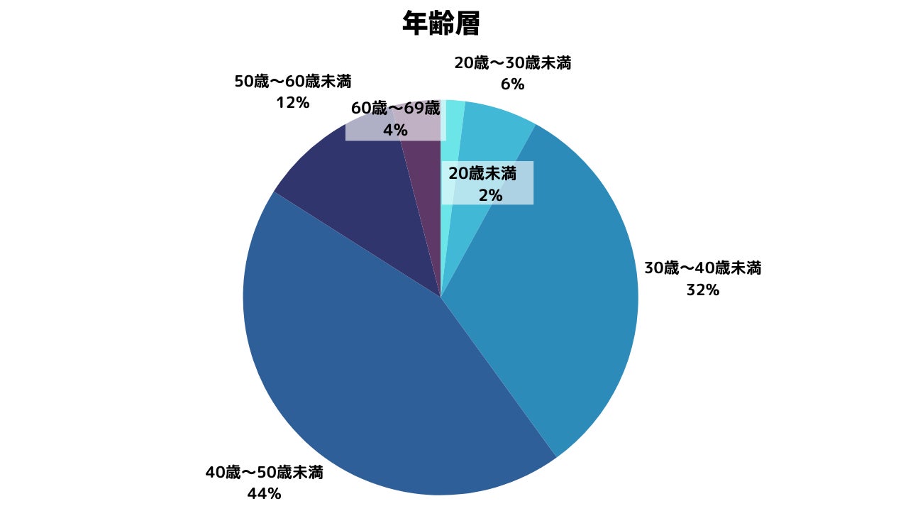 回答者の年齢層は40歳〜49歳が最も多く44.0%、次に30歳〜39歳が多く32.0%という結果になりました。