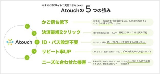 「Atouch」は2022年10月にサービスを開始し以来、LINE公式アカウントのトーク画面上で、商品を選んでそのまま決済まで完了することで、買い手のストレスフリーな顧客体験を実現(最速コンバージョンEC)したことにより、中小企業から大手企業、インフルエンサーまで幅広い事業者様にご活用いただいております。