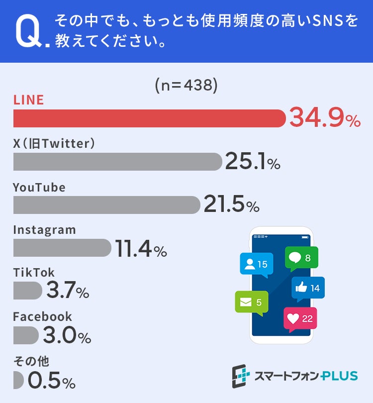「LINE」が34.9%、「X(旧Twitter)」が25.1%で「YouTube」が21.5%と並びました。