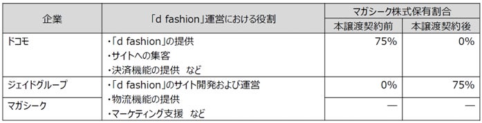 これまでドコモのファッション通販サイト「d fashion」は、ドコモの連結子会社としてマガシークが運営してまいりました。本業務提携契約により、「d fashion」は、ドコモ、ジェイドグループ、マガシークの3社がそれぞれ培ってきた企業ブランド、顧客基盤、品揃え、ノウハウ、経験などを活用し、お客さまにとってより便利にお使いいただけるサービスをめざしてまいります。