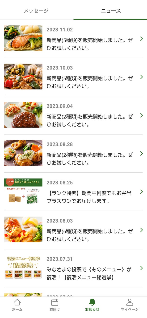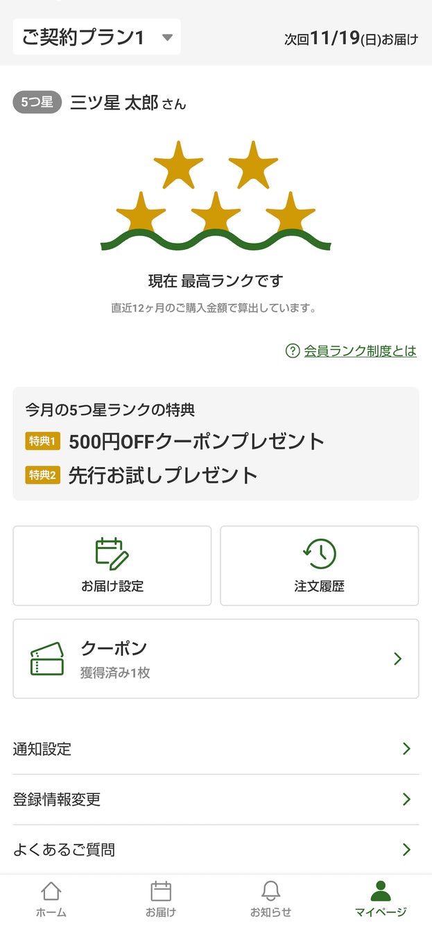・登録情報、通知、お届け情報など各種設定変更、クーポンの適用、注文履歴の確認が可能です