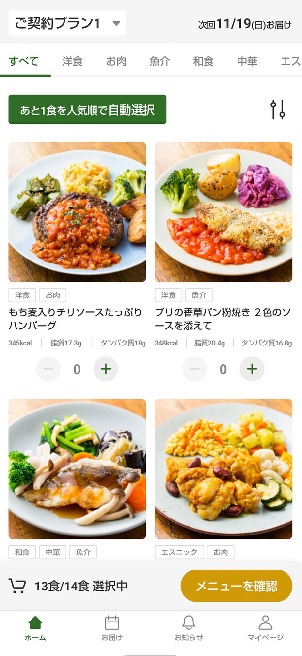 ・次回のメニューの確認、変更が可能です。メニュー表示は、和食・洋食などのカテゴリ別の表示の他、並べ替え機能によって「カロリー順」「タンパク質順」「糖質順」など、お客様自身が食事の中で意識したい栄養素からメニューを選択することができます