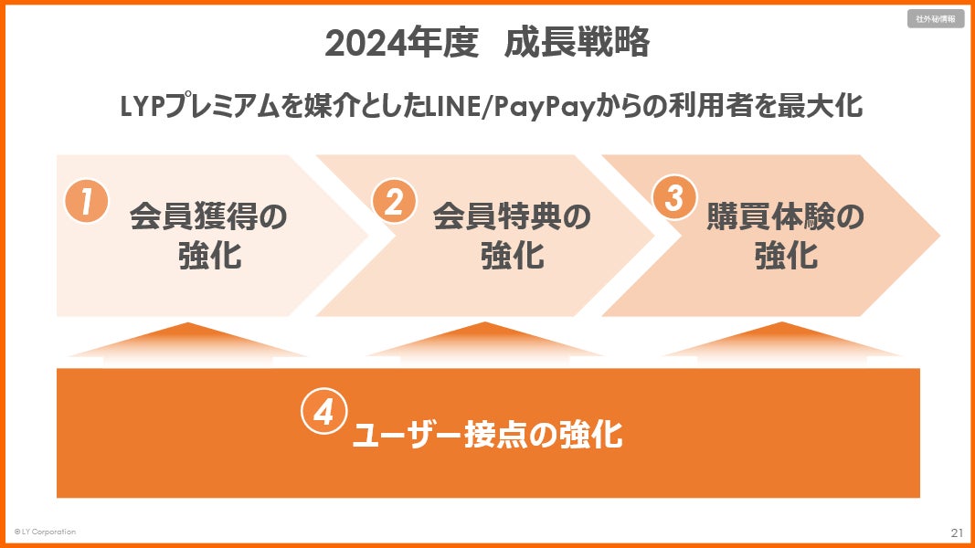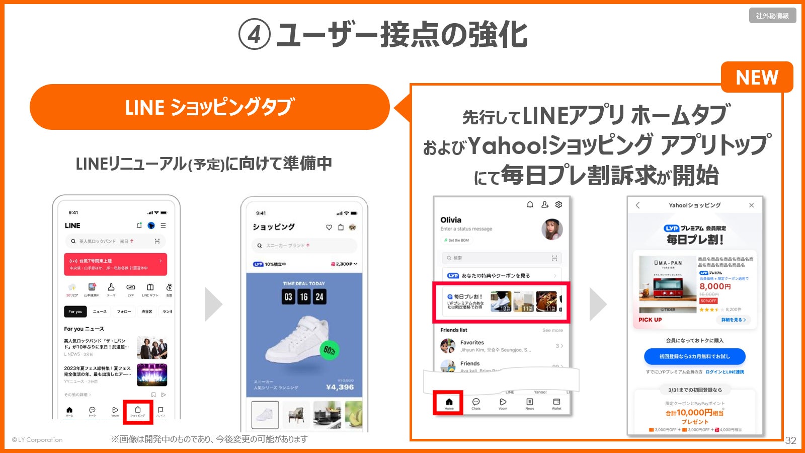 また2024年度の方針として、引き続き「LYPプレミアム」の会員を媒介とした「LINE」「PayPay」からの利用者の最大化を目指し、今後、プロモーションや訴求強化による会員獲得、初回利用や「LYPプレミアム会員なら毎日7%のPayPayポイント貯まる(※1)」などの特典の継続や磨きこみを行っていきます(※2)。ならびに動画を通じた商品検索や現在不定期で実施している付与予定のPayPayポイントをその場で使える「いますぐ利用」の拡大など、新しい購買体験も提供していきます。2024年度に予定している「LINE」アプリリニューアルに向けて、先日リリースした「LINE」アプリのホームタブにてLYPプレミアム会員限定の価格のタイムセール商品を掲出する「毎日プレ割」を紹介しました。「PayPay」アプリからの「Yahoo!ショッピング」への導線(※3)も強化され、「LINE」「PayPay」ユーザーの「Yahoo!ショッピング」への接点を強化していきます。