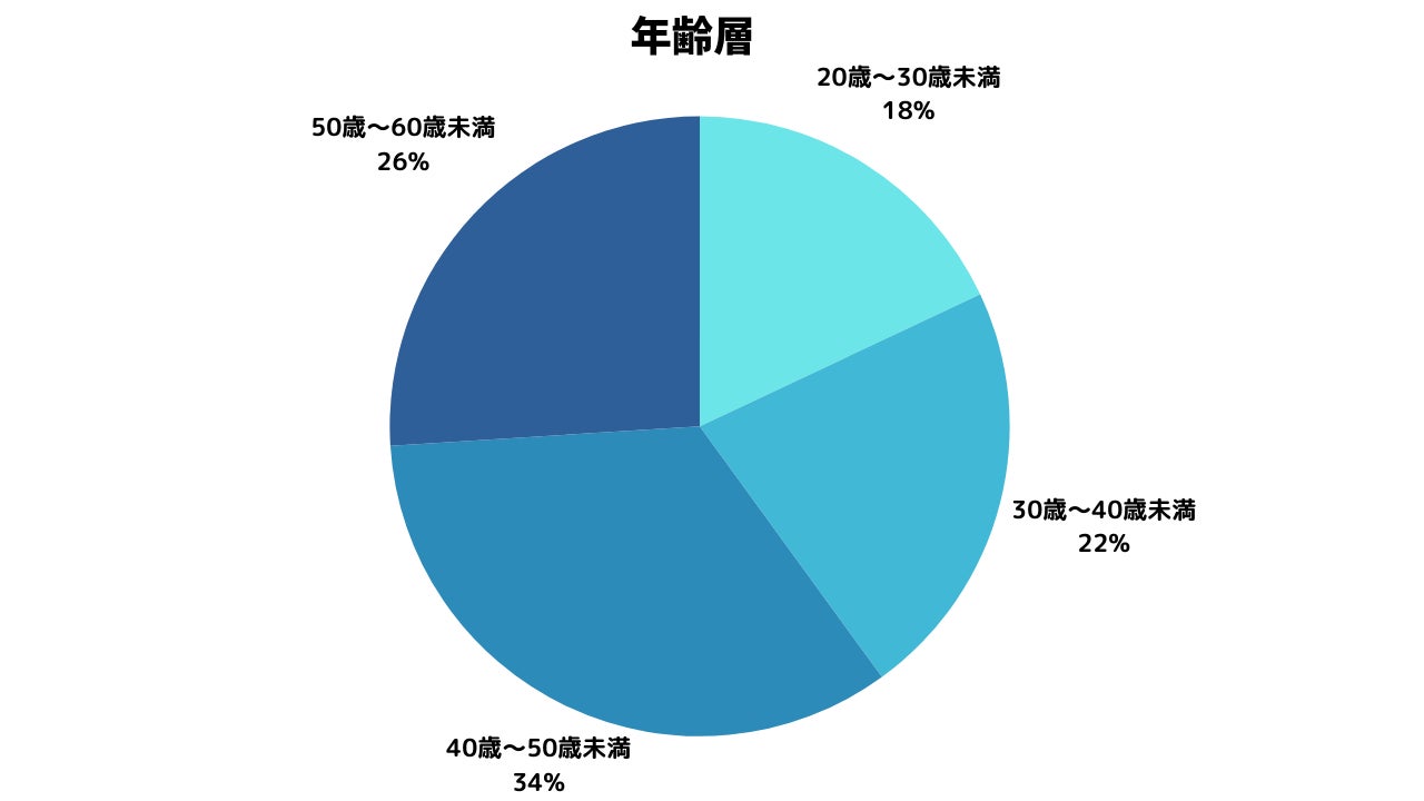 回答者の年齢層は40歳〜50歳未満が最も多く34.0%、次に30歳〜40歳未満が多く22.0%という結果になりました。