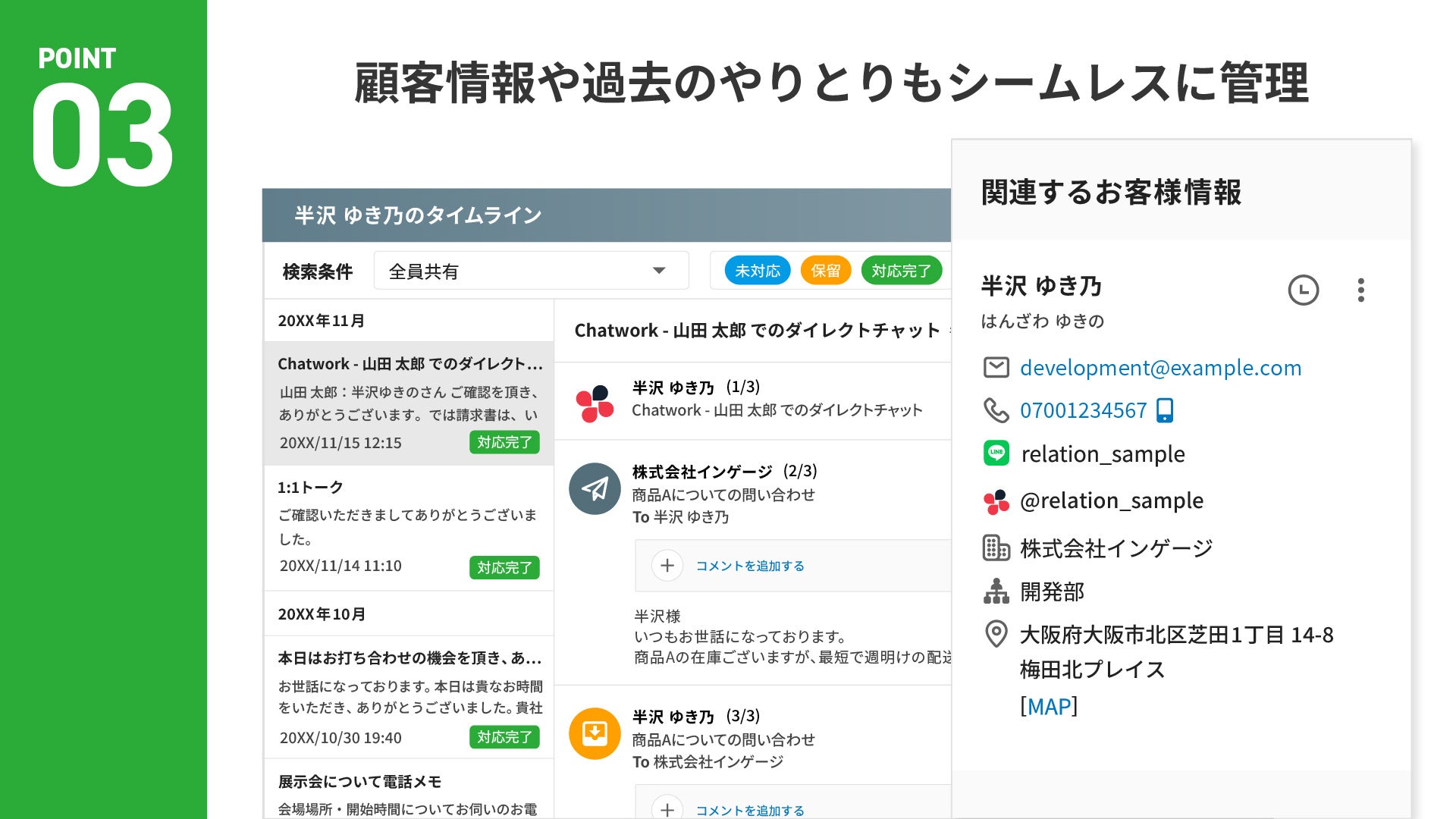 複数チャネルにまたがる顧客情報を一箇所に集約できます。『Chatwork』を含む各チャネルのやりとりがタイムライン形式で表示されるので、過去のやりとりをシームレスに確認することができます。
