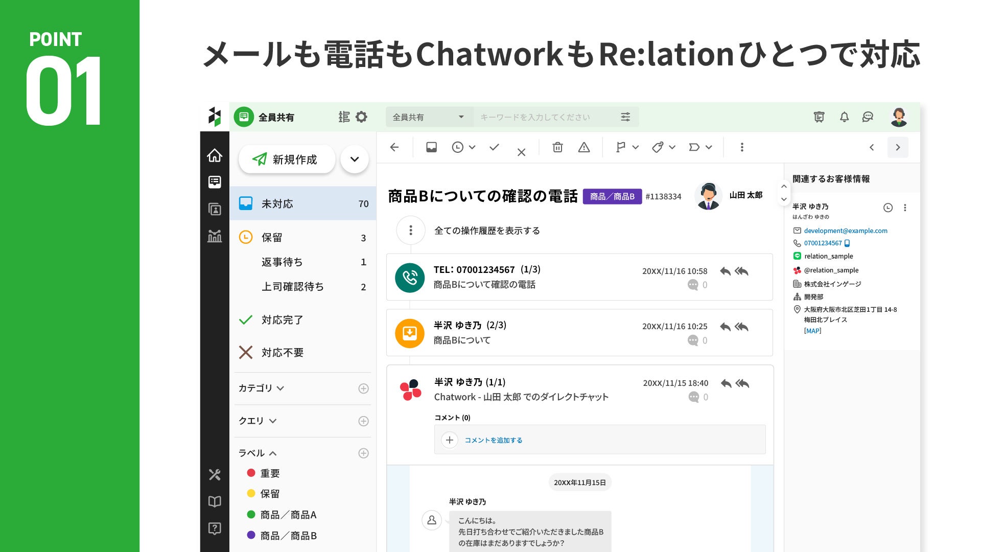 『Chatwork』に届いたメッセージを『Re:lation』で送受信できます。メールや電話など従来のコミュニケーションもすべて集約。クライアントごとに連絡方法が違っていても、担当者は『Re:lation』ひとつで対応ができます。