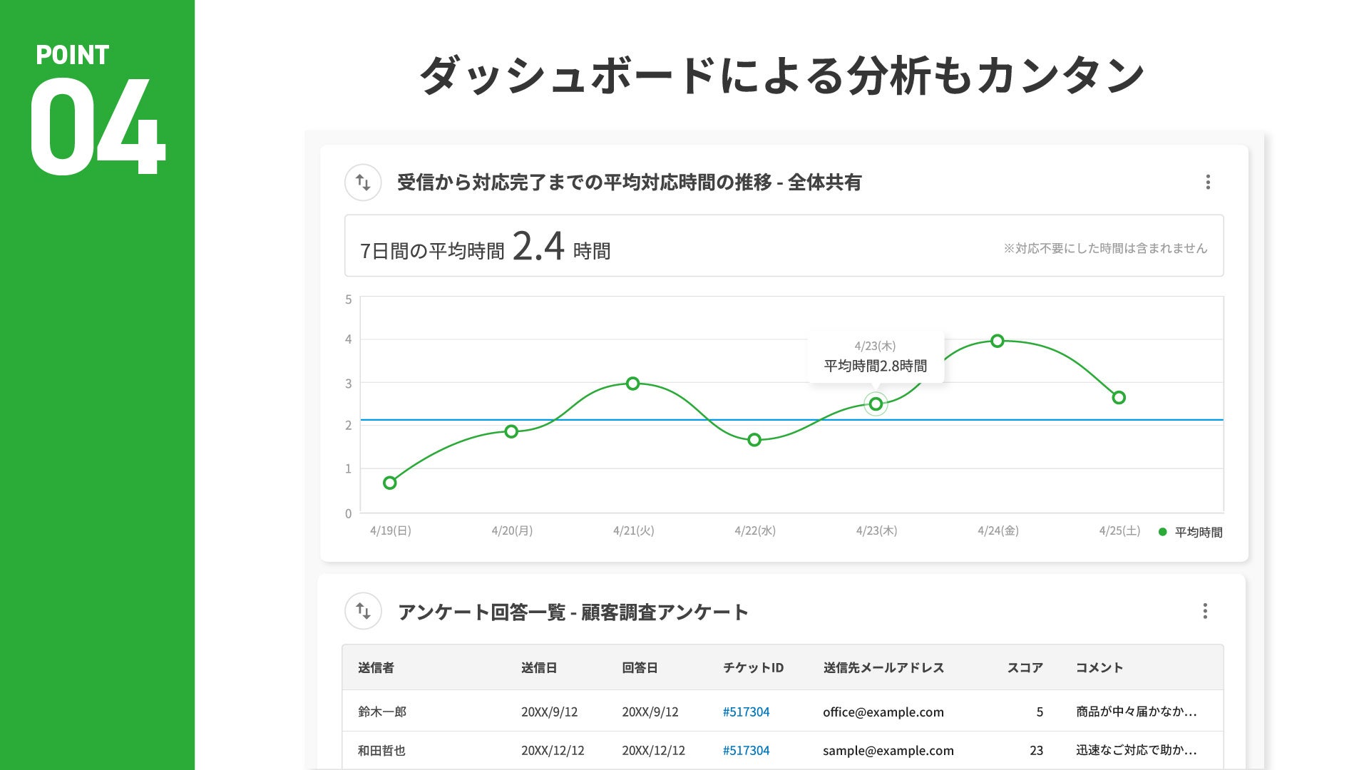 ダッシュボード機能によって「受信~対応完了までの時間」や「メッセージの統計」など知りたいデータをカンタンに分析できます。