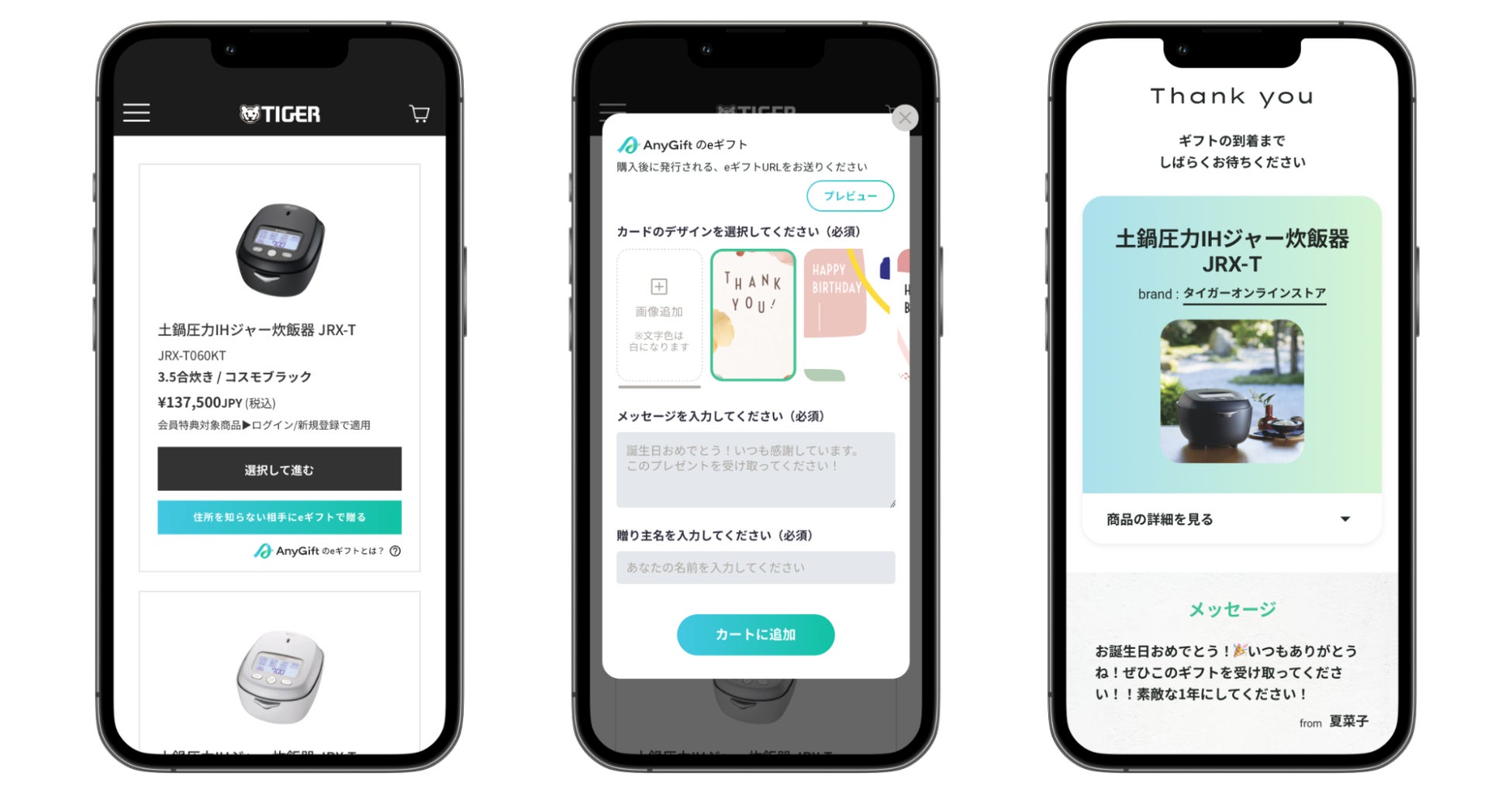今回、当社の『AnyGift』サービス提供により、真空断熱ボトルや炊飯器、電気圧力鍋などタイガー魔法瓶の人気商品が、eギフトとして贈ることができるようになります。