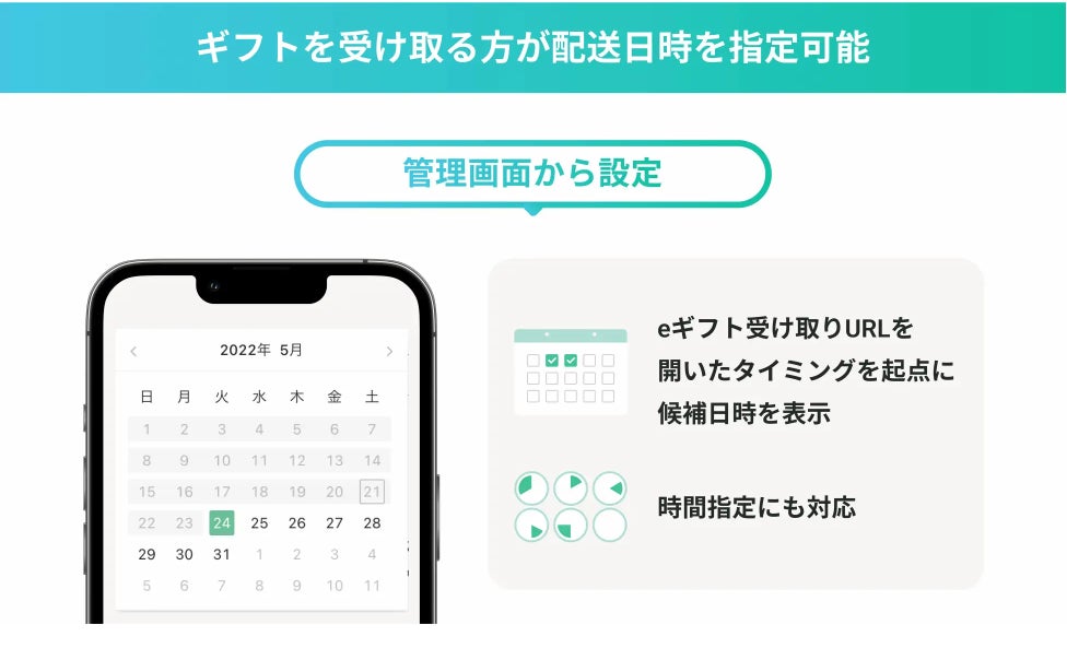 eギフトを受け取る方が、商品の配送日時を指定することができます。eギフト受け取りURLを開いたタイミングを起点に候補日時を表示します。受け取る方が自身の都合に合わせた日時で受け取れることによって、送り手側もより気軽に相手の方にeギフトで商品を購入して送ることができます。