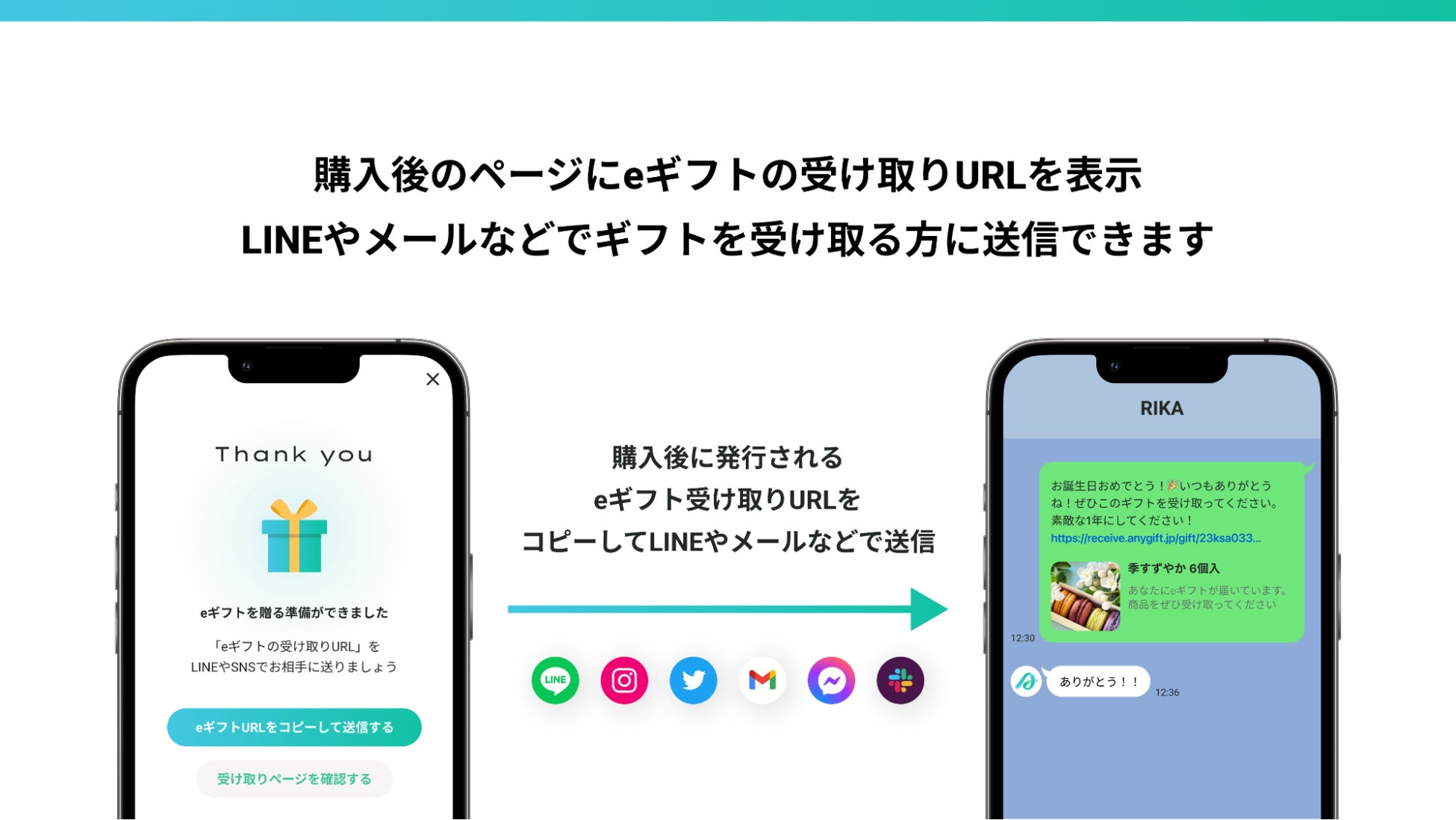 『AnyGift』は、相手の住所を知らなくてもSNSやオンラインで気軽に贈れるeギフト機能を、ノーコードで自社ECサイトに組み込むことができるサービスです。『AnyGift』を導入することで、ECサイトで購入をするお客さまは、送り先の住所を知らなくてもLINEやメールなどでURLを送り、簡単にギフトを贈れるようになります。また、お客さまのLINEやメールと連携することで、継続的にコミュニケーションをとれるため、リピーターとして再来訪していただける可能性が高くなります。