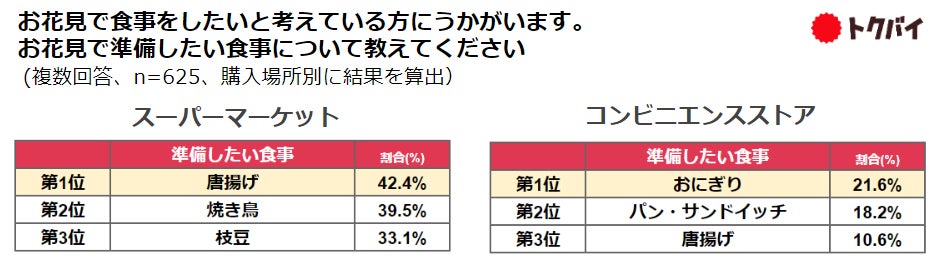 - お花見の食事は「手作り」より「購入」が多数。スーパーでは「唐揚げ」、コンビニでは「おにぎり」が一番人気