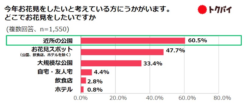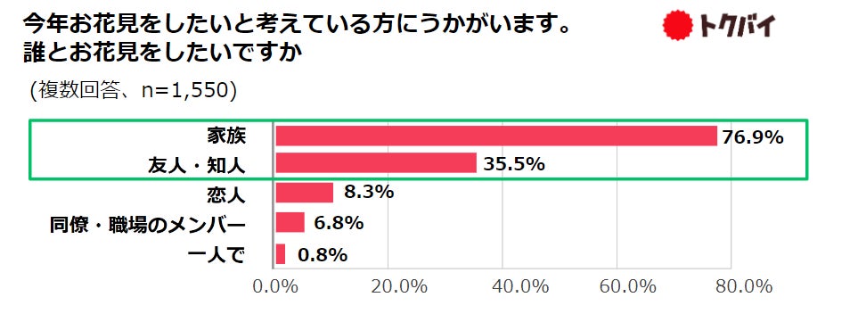 今年お花見をしたいと考えている人に、誰とお花見をしたいかたずねたところ、「家族」が76.9%で圧倒的に多く、次いで「友人・知人」35.5%となりました。お花見をしたい場所は「近所の公園」が60.5%で最多となり、「お花見スポット(公園、飲食店、ホテルを除く)」47.7%、「大規模な公園」33.4%と続きました。