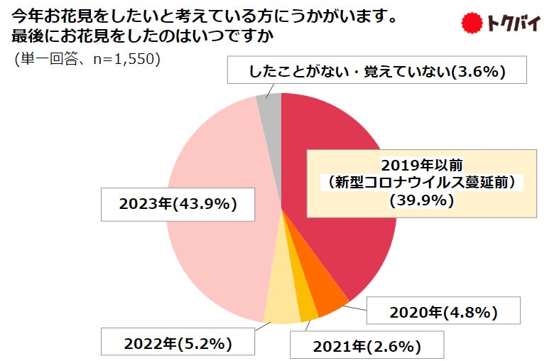 「トクバイ」ユーザーに今年(2024年)のお花見についてたずねたところ、6割以上がお花見をしたいと考えていることがわかりました。今年「お花見をしたい」と考えている人に最後にお花見をした時期をたずねたところ、約4割が新型コロナウイルスが蔓延する前の「2019年」と回答しました。新型コロナウイルスが5類に移行してから、今年は初めてのお花見ということもあり、5年ぶりのお花見を検討する人が多い様子がうかがえました。