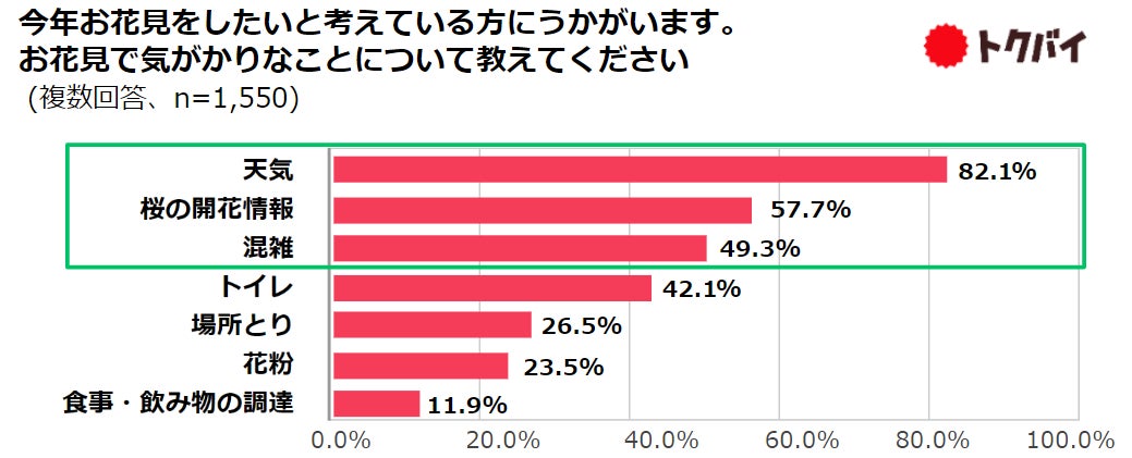 - お花見で気がかりなことは「天気」「桜の開花状況」「混雑」。理由は「雨だと飲食ができない」「準備をしても天気次第で無駄になってしまう」「混雑しているとゆっくり桜を見れない」との声