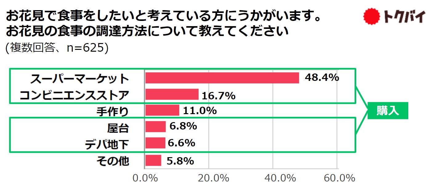 今年のお花見で食事をしたいと考えている人に、食事の調達方法と内容についてたずねたところ、食事を「手作り」する人より「購入」する人が多いことがわかりました。調達ルートは「スーパーマーケット」が48.4%、「コンビニエンスストア」が16.7%という回答でした。