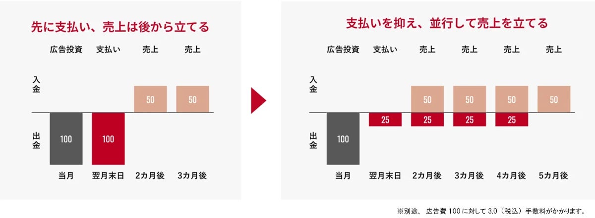 「AD YELL」は、Web広告の出稿費用を4回に分割・後払いが可能となるサービスです。請求書払いと法人カード払いに対応しており、オンラインによるお申し込みから最短3営業日でご利用が可能になります。原則として、担保や連帯保証人のご用意が不要(※6)で、融資ではなく立替でサポートするため、今後の事業者さまの借入枠にも影響を及ぼしません。これらのサービスを通じて、事業者様のキャッシュサイクルを改善し、運転資金を圧迫しない形で事業成長を支援いたします。