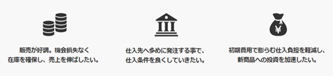 「STOCK YELL」は、商品の仕入れにかかる費用を4回に分割・後払いにできるサービスです。オンラインによるお申し込みから最短3営業日でご利用が可能になります。「AD YELL」と同様に、原則として、担保や連帯保証人のご用意が不要(※6)で、融資ではなく立替でサポートするため、今後の事業者さまの借入枠にも影響を及ぼしません。これらのサービスを通じて、事業者様のキャッシュサイクルを改善し、運転資金を圧迫しない形で事業成長を支援いたします。