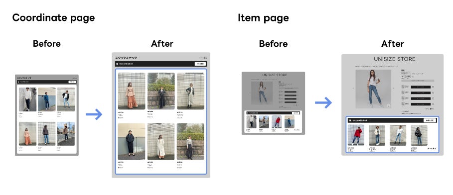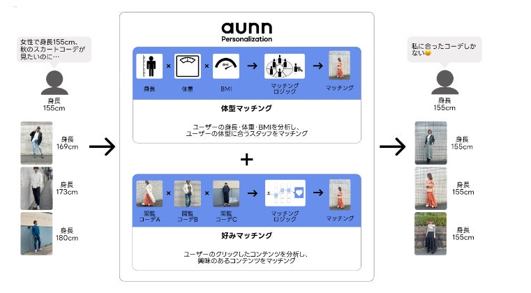 今回のaunnプロジェクトフェーズ2によって、ECサイトのTOPや商品一覧ページ、商品詳細ページ(フェーズ1で提供開始した機能です)において、ユーザーの体型や好みに合わせたスタッフのコーディネート画像を優先的に表示する機能を提供できるようになりました。つまり、ユーザーが、ECサイトで商品を探す際に、自分の体型にマッチしたコーディネート画像が表示されるようになります。今までのアパレルECにおいては、「好みの服を発見しても、商品詳細を見て自分のサイズに合わずに断念」「コーディネート情報が溢れ、ユーザーが自身に合ったスタッフのコーディネートを探すことが面倒」といった残念な顧客体験が生まれていました。aunnプロジェクトは、そうした課題を解決し、アパレルECでのより楽しいショッピング体験を実現します。