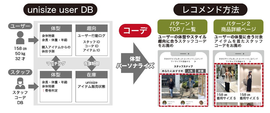 メイキップはサイズレコメンドエンジン「unisize」の提供を通じて、約300サイトへ導入、月間アクティブユーザー数は200万MAU(Monthly Active Users)を超えており、圧倒的な量の体型データを保有しています。その資産を活かし、ユーザーの体型から最適なスタッフコーディネートを割り出し、優先的に表示させるというシステムを開発しました。