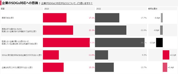 企業がSDGsに対応することへの意識について、「義務であると思う(17.1%)」「義務とまでは言わないものの、配慮しない企業があれば非難されて当然だと思う(22.1%)」を合わせた、SDGsへの対応を当たり前と捉える人が39.2%となった。「企業はまずビジネスに専念すればよいと思う(15.1%)」「SDGsに取り組む余裕のある企業だけが行えばよいと思う(11.6%)」を合わせた、ビジネスが優先だと考える人が26.7%となった。