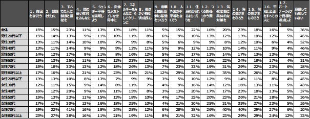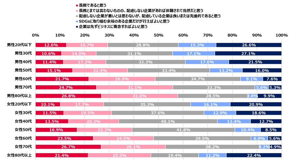 性年代別に見ると、男女ともに20代以下は「ビジネス専念」「余裕のある企業が行えばよい」が40%前後と他の年代よりも高く、ビジネス優先の傾向が見られた。また、男女ともに70代は「義務」「配慮しないと非難されて当然」が50%超となった。高い年代において、SDGsへの対応を優先して考えている傾向が見られた。