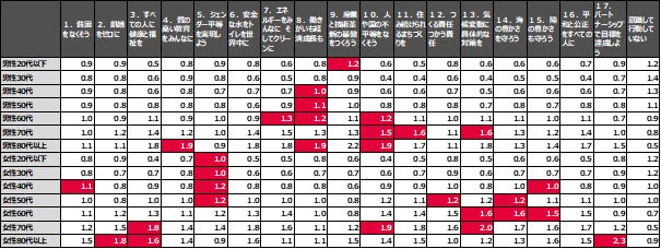 赤で強調している数値は、各性年代で上位3位の項目(リフト値1.0未満は除く)です