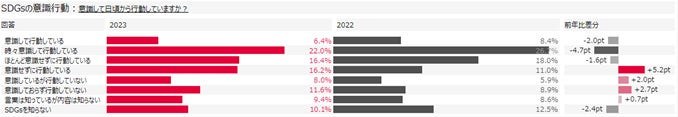 SDGsに関する行動率の内訳を見ると、「意識せずに行動している」が前年より5.2ポイント増加しており、他の項目よりも増加幅が大きかった。意識をしているかどうかに関わらず「行動している」との回答は約6割となり、SDGsに関する行動が日常の生活に定着している様子が伺えた。