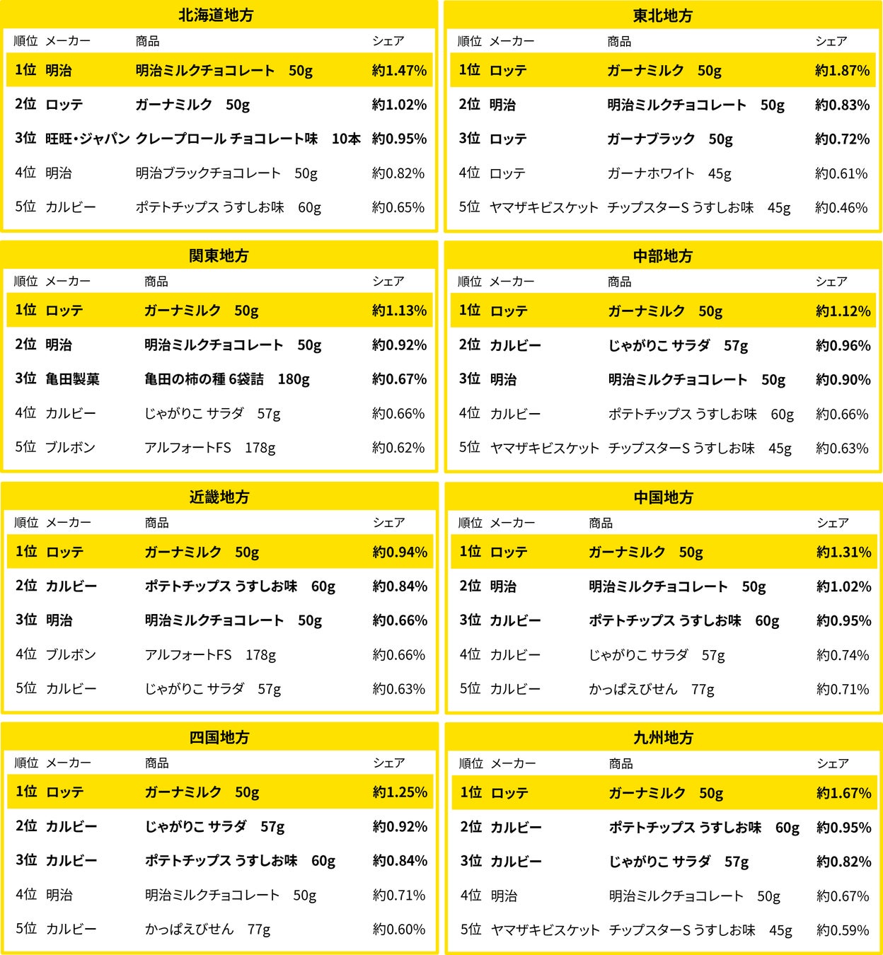 その他、全国ランキングでは、「じゃがりこ」が3位、「ポテトチップス」が4位、7位、8位、「アルフォート」が5位、「かっぱえびせん」が10位となりました。地方別ランキングにおいても、「じゃがりこ」と「ポテトチップス」は上位にランクインしている地方が多く、「スナック菓子」の需要の高さも明らかとなりました。さらに、地方別ランキングでは、北海道地方や東北地方などの東日本では「甘いもの」が上位に、四国地方や九州地方などの西日本では「しょっぱいもの」が上位になるなど、地方ごとに味の特色があることが分かりました。