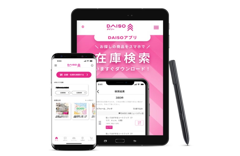 『DAISOアプリ』は国内約3,300店舗、約6万8,000商品を対象とした店舗・在庫検索機能を搭載するスマートフォンアプリです。店舗を選び検索すると、探している商品の在庫状況が確認でき、希望店舗に在庫がなかった場合でも近隣店舗の在庫状況も検索が可能です。