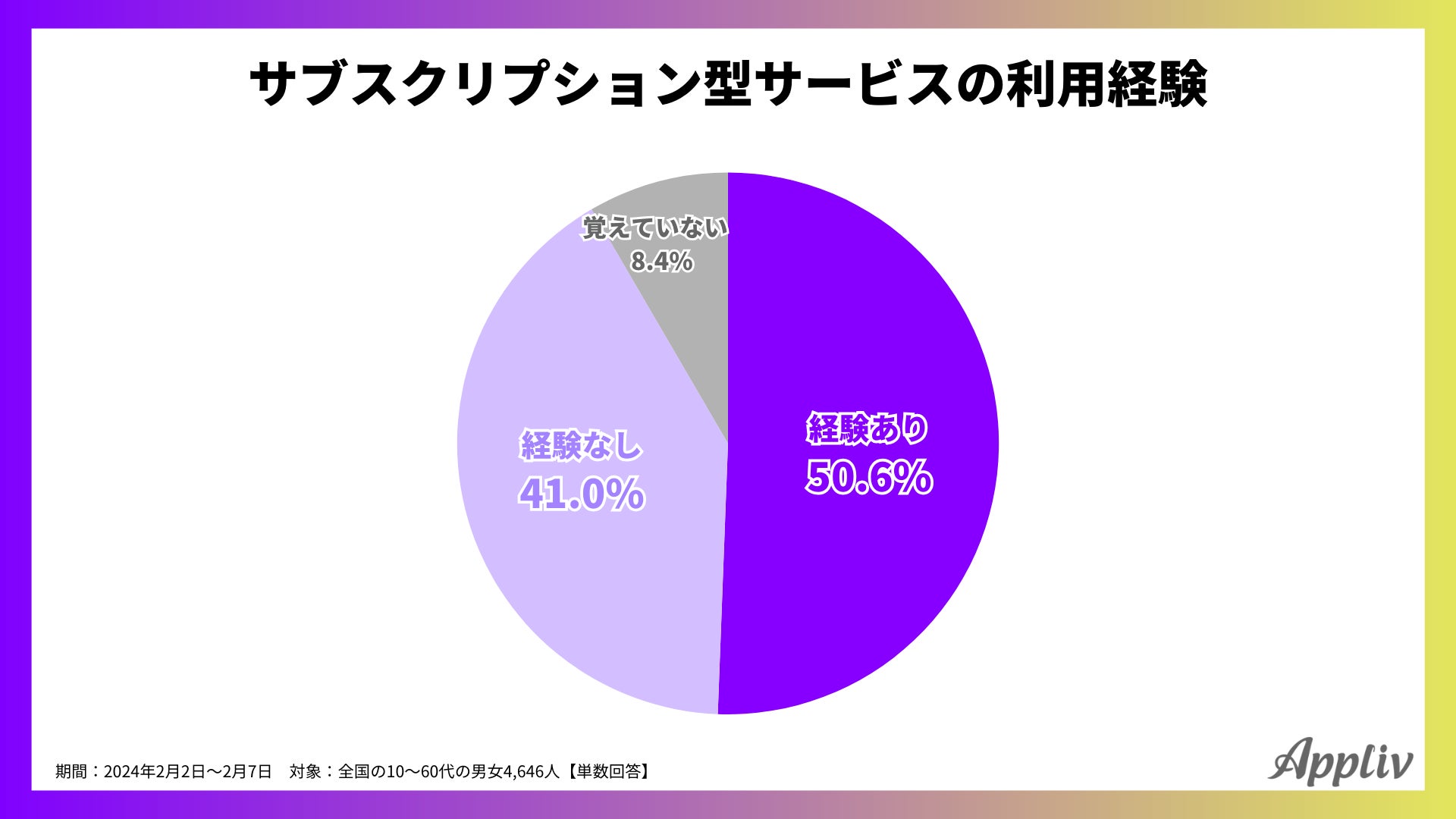 事前調査で10~60代の男女4,646人を対象に、サブスクリプション型サービスを利用したことがあるか調査した結果、「経験あり」が50.6%、「経験なし」が41.0%と、利用経験者がやや上回る結果となりました。