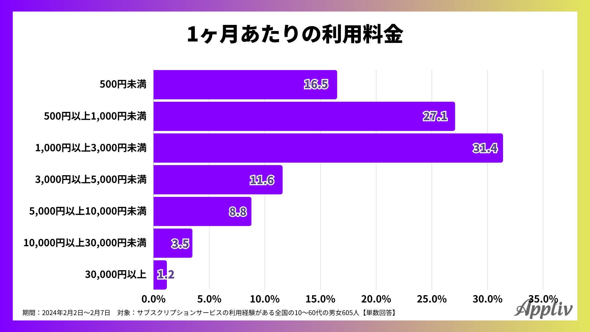続いて、毎月の利用金額を聞いてみると、最も多いのは「1,000~3,000円未満(31.4%)」、次いで「500~1,000円未満(27.1%)」、「500円未満(16.5%)」でした。