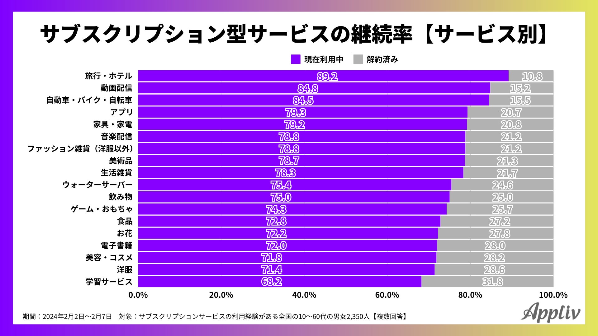 - 継続率が高いサブスクサービスは1位「旅行・ホテル」、続いて「動画配信」