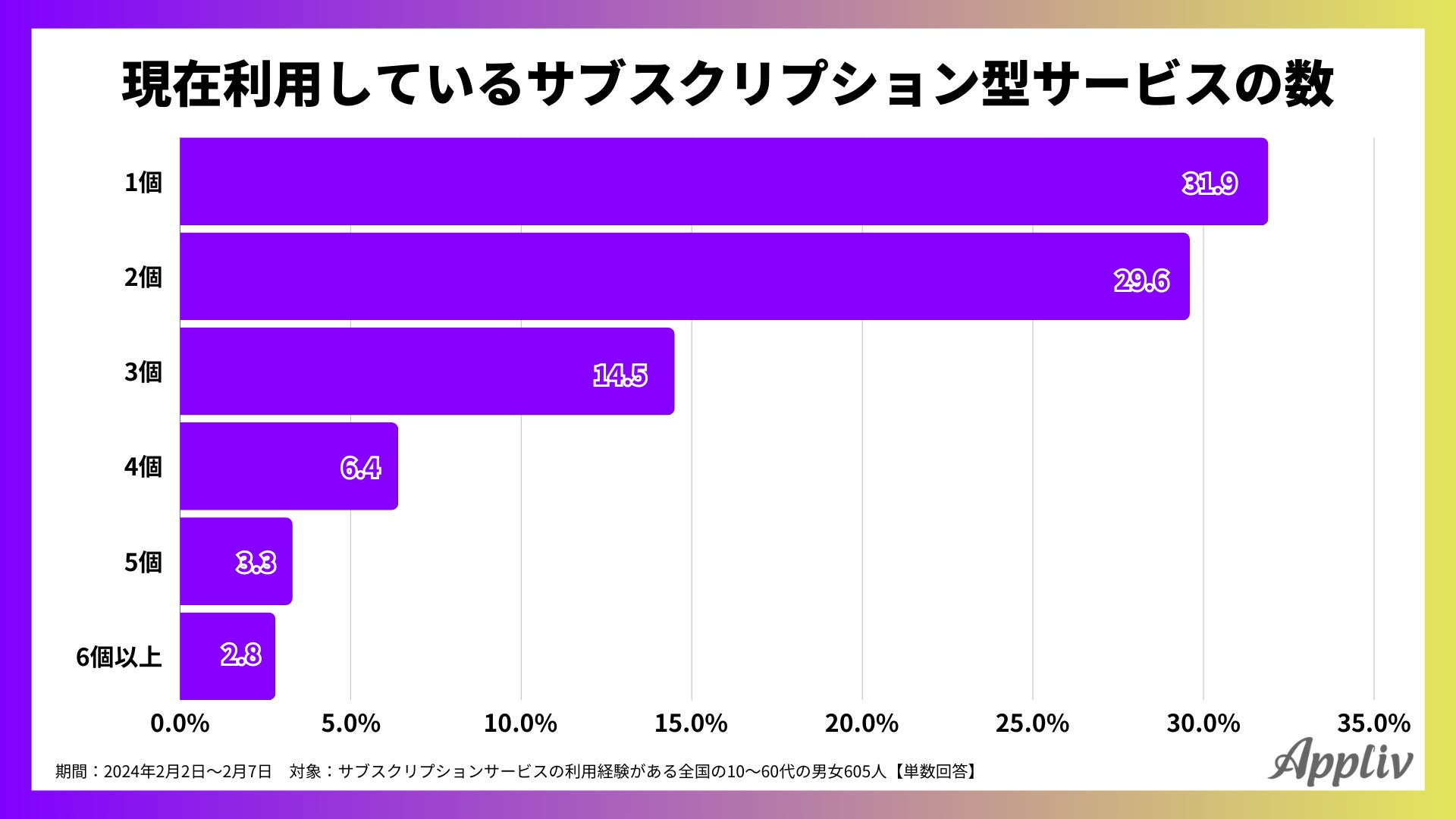 現在契約しているサービスの数を尋ねると、「1個(31.9%)」が最も多く、次いで「2個(29.6%)」、「3個(14.5%)」という結果でした。