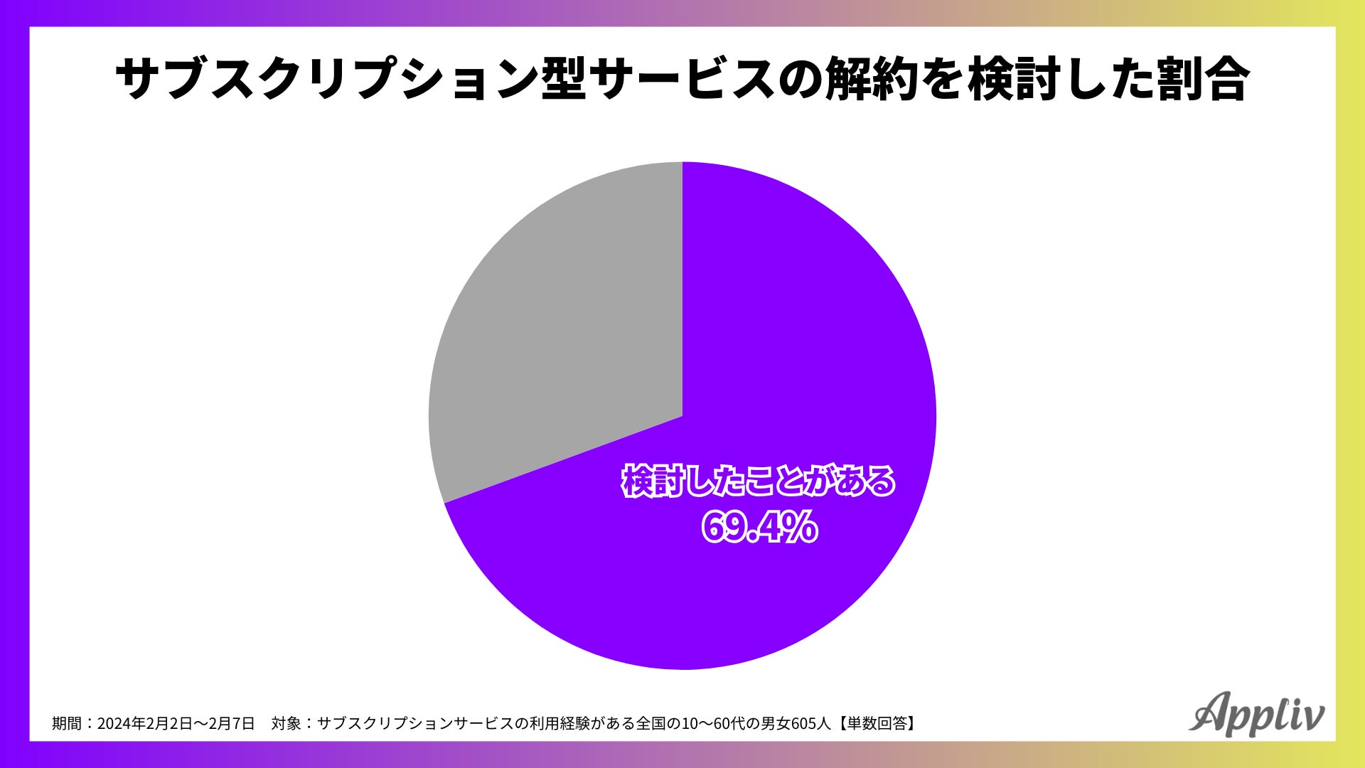 サブスク型サービスの解約を検討した経験を調べると、検討したことがある人は69.4%でした。
